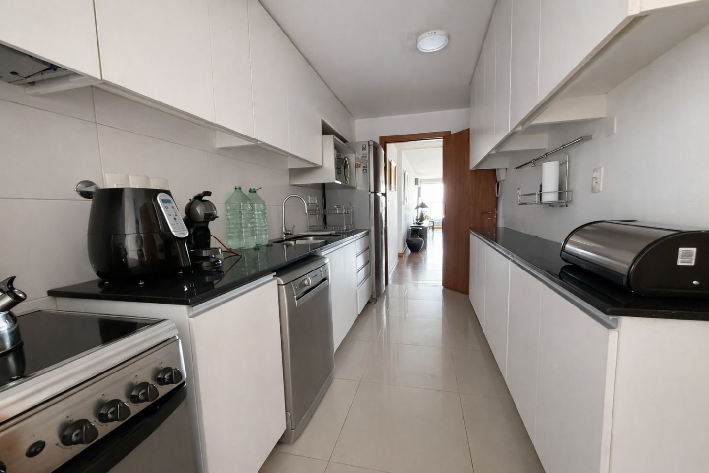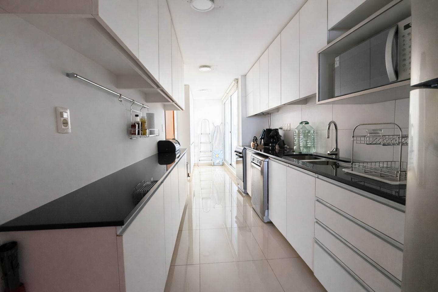 Desde el área social, la circulación conduce a la cocina definida, cómoda y funcional, con excelente capacidad de guardado y terraza lavadero independiente.